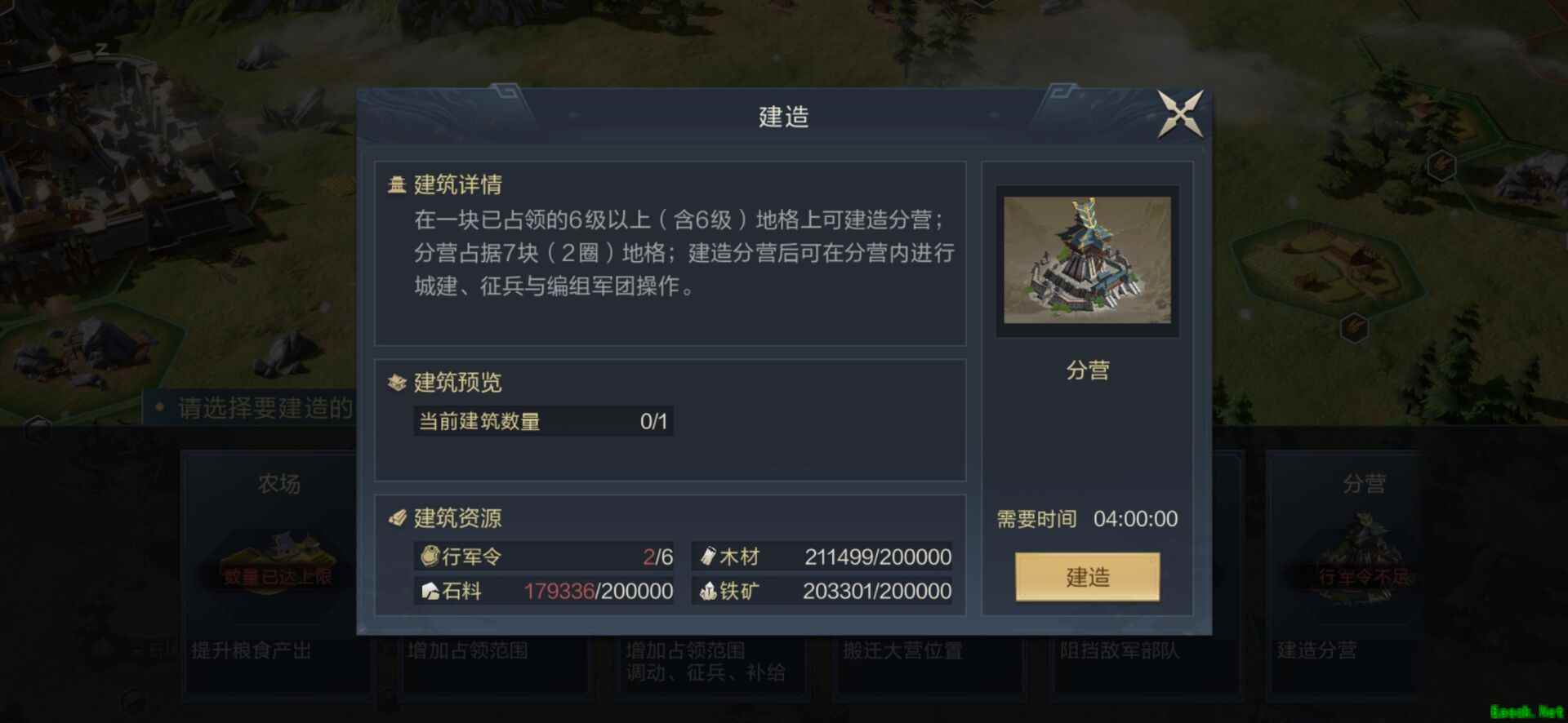 二、分营建造方法 1、需求一块6级以上(含6级)地格,点击建造可以看到【分营】选项。 2、消耗6行军令,木材/石料/铁矿各20万。 3、需要时间4小时。