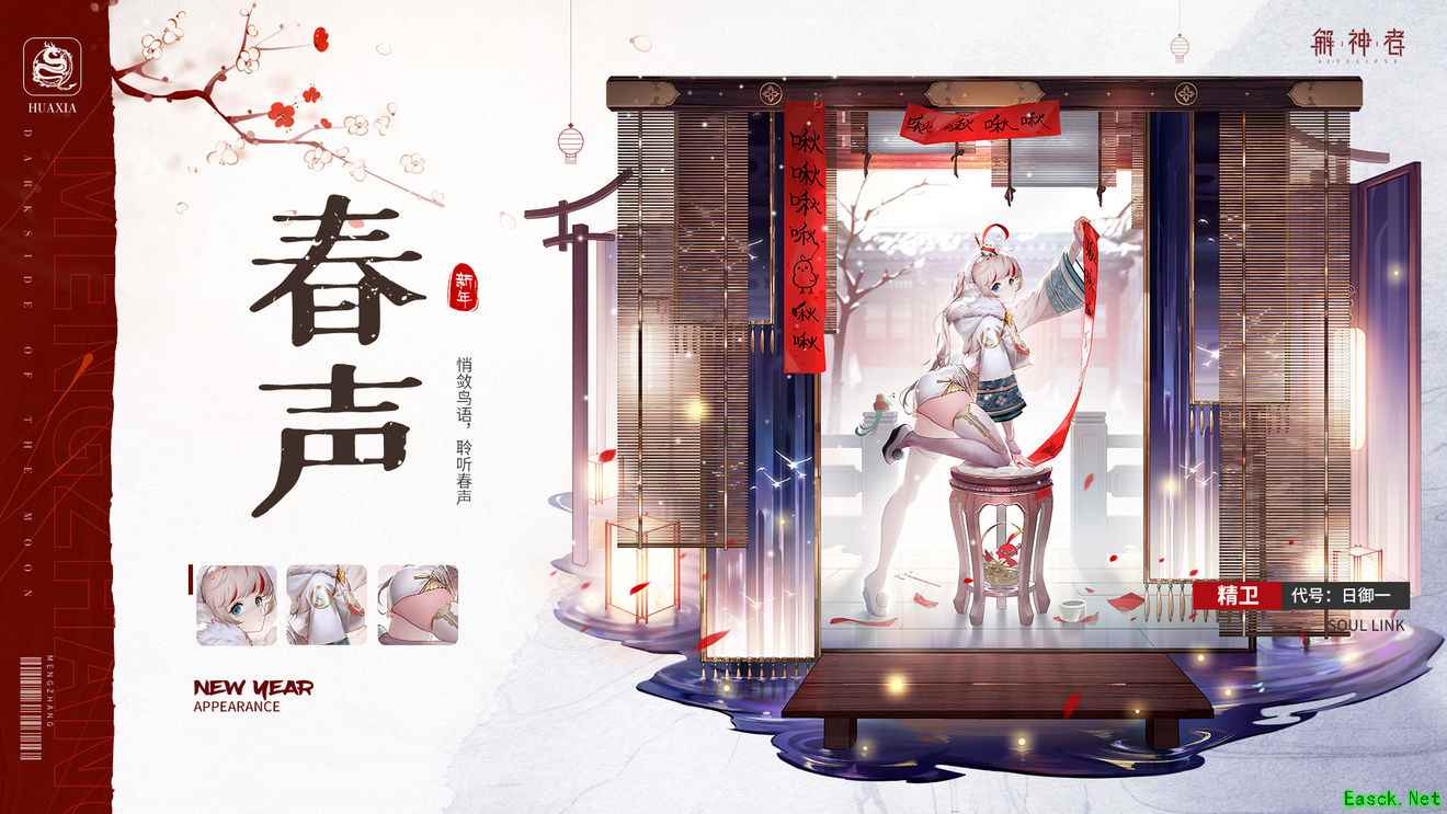 《解神者》2021春节皮肤汇总一、精卫春节限定外观 皮肤名称:春声 获取途径:更新维护后至2021年2月19日5:00限时折扣,之后恢复原价购买。2021年3月5日5:00下架。 皮肤介绍: “拂晓天初醒,顾盼倏回眸”,换上新装的精卫会是怎样的模样? 戴着墨镜拉二胡的小红,陶醉在自己的艺术之梦中,用演奏为大家传递新年的祝福。 圆滚滚的小白一如往日慵懒,紧紧攥着心爱的糖葫芦,品尝酸酸甜甜的美味。 小青换上新年的装束,在二胡声中大展歌喉,清晨的小院更加热闹起来。
