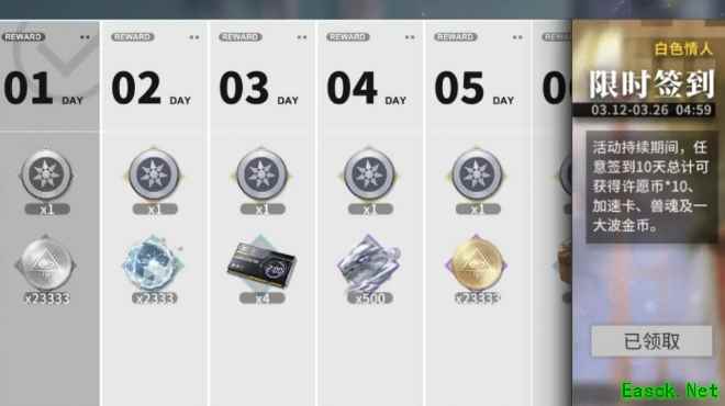 《解神者》白色情人限时活动十连领取方法一、签到奖励 白色情人限时活动开启,签到即可领十连! 活动时间:3月12日—3月26日04:59 活动持续期间,任意签到10天总计可获得【许愿币*10】,并且还有加速卡、兽魂、大波金币等着你! 不要错过哟!