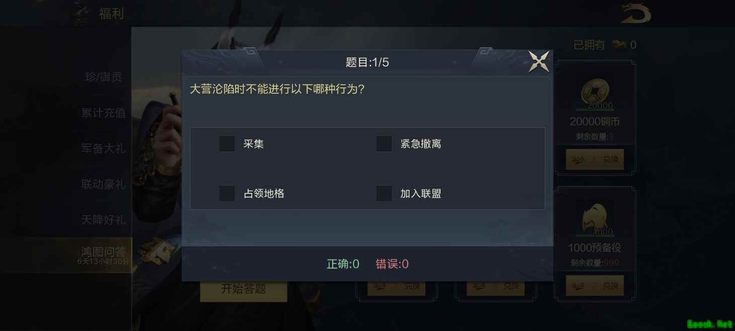 问题: 大营沦陷时不能进行以下哪种行为? 选项: 采集、紧急撤离、占领地格、加入联盟 答案: 加入联盟 活动介绍: 每天可进行一次答题,每次答题共有5道题,答题结束后根据正确题目的数量发放活动道具。没有答对获得1个活动道具,答对1题获得2个活动道具,答对2题获得3个活动道具,答对3题获得5个活动道具,答对4题获得7个活动道具,答对5题获得10个活动道具。 活动共持续7天,每日0点重置答题状态。 可在商店处通过活动道具兑换物品,物品剩余数量为活动期间可兑换的总数量,剩余数量为0后不可再进行兑换。 进行兑换后会对拥有的活动道具进行相应的扣除。 以上就是小编整理关于《鸿图之下》大营沦陷时不能进行以下哪种行为答案介绍的全部内容,想知道更多相关资讯攻略的请关注易采游戏网。 本文内容来源于互联网,如有侵权请联系删除。 |