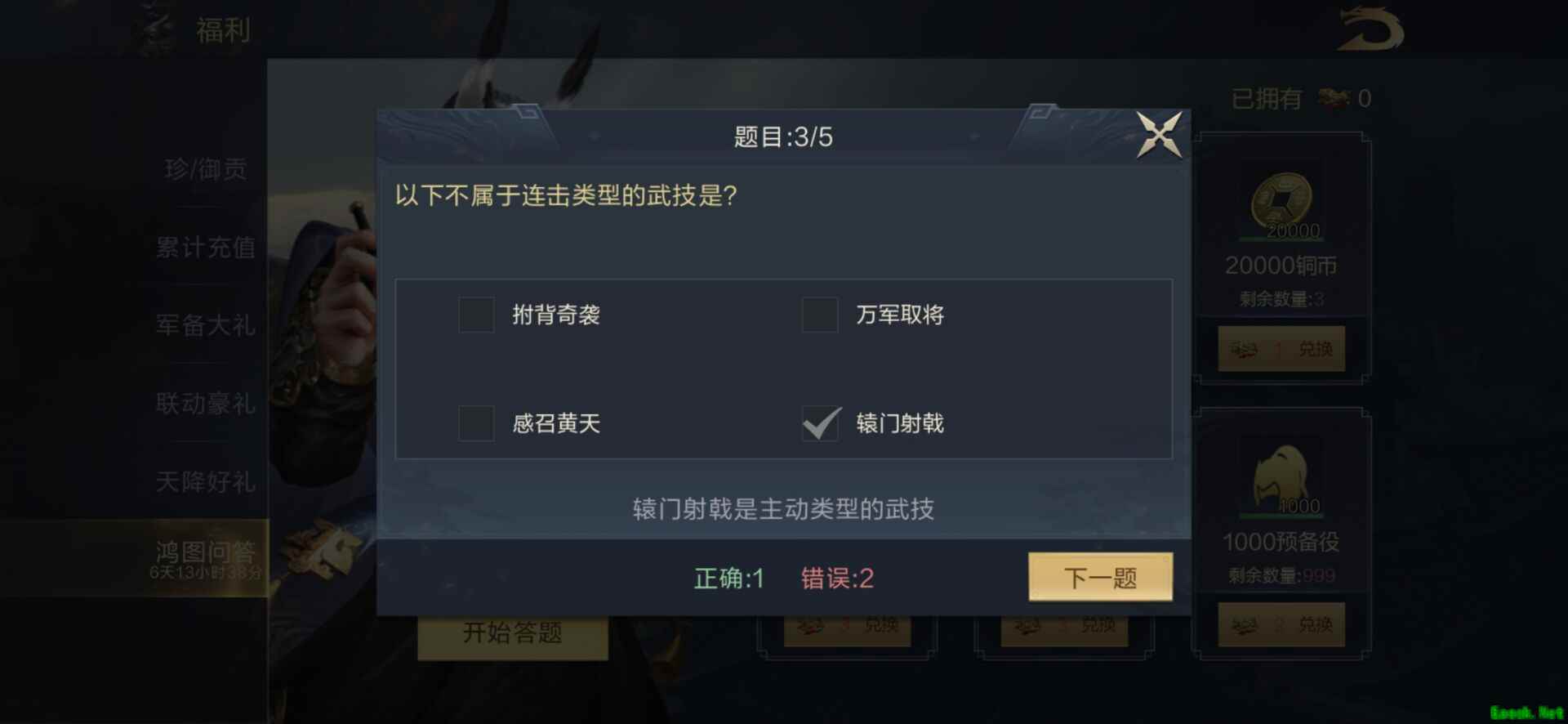 问题: 以下不属于连击类型的武技是? 选项: 拊背奇袭、万军取将、感召黄天、辕门射戟 答案: 辕门射戟 活动介绍: 每天可进行一次答题,每次答题共有5道题,答题结束后根据正确题目的数量发放活动道具。没有答对获得1个活动道具,答对1题获得2个活动道具,答对2题获得3个活动道具,答对3题获得5个活动道具,答对4题获得7个活动道具,答对5题获得10个活动道具。 活动共持续7天,每日0点重置答题状态。 可在商店处通过活动道具兑换物品,物品剩余数量为活动期间可兑换的总数量,剩余数量为0后不可再进行兑换。 进行兑换后会对拥有的活动道具进行相应的扣除。 以上就是小编整理关于《鸿图之下》以下不属于连击类型的武技是答案介绍的全部内容,想知道更多相关资讯攻略的请关注易采游戏网。 本文内容来源于互联网,如有侵权请联系删除。 |