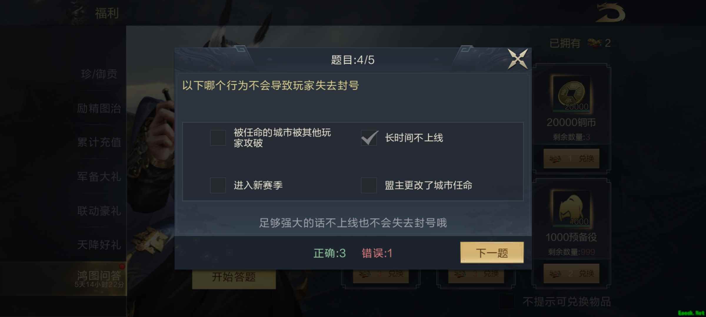 问题: 以下哪个行为不会导致玩家失去封号? 选项: 被任命的城市被其他玩家攻破、长时间不上线、进入新赛季、盟主更改了城市任命 答案: 长时间不上线 活动介绍: 每天可进行一次答题,每次答题共有5道题,答题结束后根据正确题目的数量发放活动道具。没有答对获得1个活动道具,答对1题获得2个活动道具,答对2题获得3个活动道具,答对3题获得5个活动道具,答对4题获得7个活动道具,答对5题获得10个活动道具。 活动共持续7天,每日0点重置答题状态。 可在商店处通过活动道具兑换物品,物品剩余数量为活动期间可兑换的总数量,剩余数量为0后不可再进行兑换。 进行兑换后会对拥有的活动道具进行相应的扣除。 以上就是小编整理关于《鸿图之下》以下哪个行为不会导致玩家失去封号答案介绍的全部内容,想知道更多相关资讯攻略的请关注易采游戏网。 本文内容来源于互联网,如有侵权请联系删除。 |