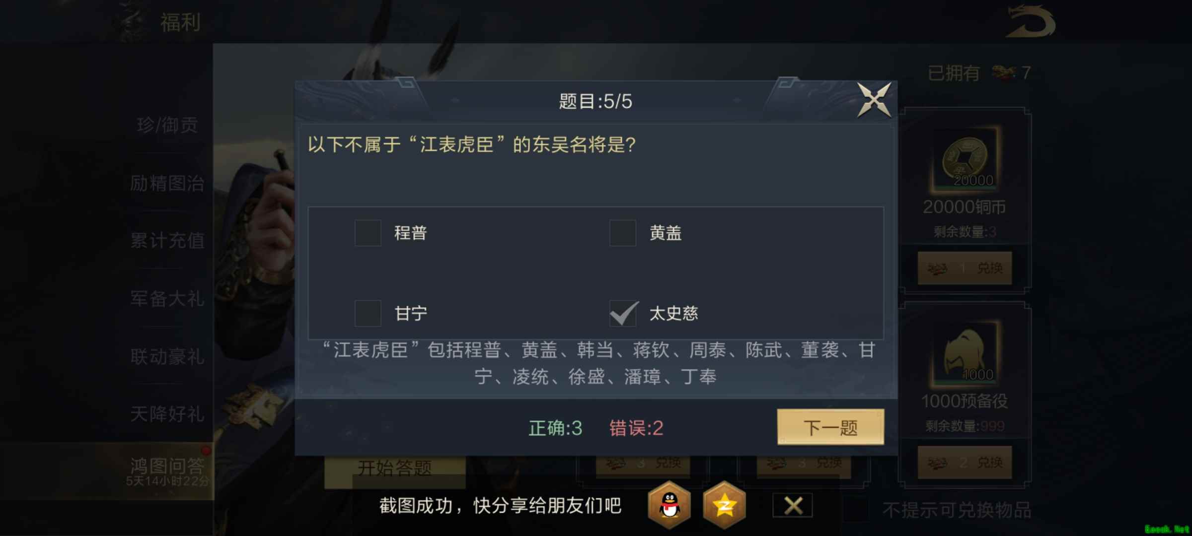问题: 以下不属于“江表虎臣”的东吴名将是? 选项: 程普、黄盖、甘宁、太史慈 答案: 太史慈 活动介绍: 每天可进行一次答题,每次答题共有5道题,答题结束后根据正确题目的数量发放活动道具。没有答对获得1个活动道具,答对1题获得2个活动道具,答对2题获得3个活动道具,答对3题获得5个活动道具,答对4题获得7个活动道具,答对5题获得10个活动道具。 活动共持续7天,每日0点重置答题状态。 可在商店处通过活动道具兑换物品,物品剩余数量为活动期间可兑换的总数量,剩余数量为0后不可再进行兑换。 进行兑换后会对拥有的活动道具进行相应的扣除。 以上就是小编整理关于《鸿图之下》以下不属于江表虎臣的东吴名将是答案介绍的全部内容,想知道更多相关资讯攻略的请关注易采游戏网。 本文内容来源于互联网,如有侵权请联系删除。 |