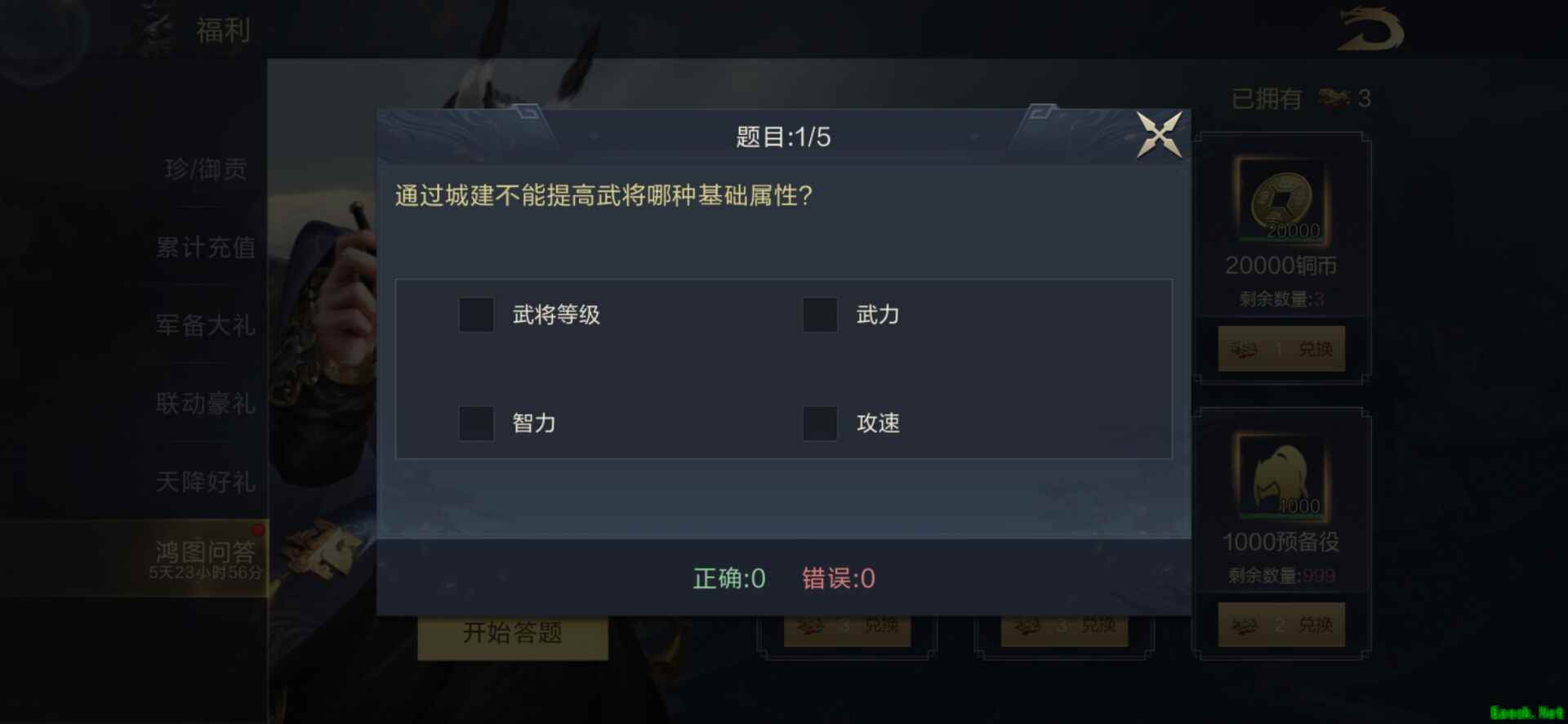 问题: 通过城建不能提高武将哪种基础属性? 选项: 武将等级、武力、智力、攻速 答案: 武将等级 活动介绍: 每天可进行一次答题,每次答题共有5道题,答题结束后根据正确题目的数量发放活动道具。没有答对获得1个活动道具,答对1题获得2个活动道具,答对2题获得3个活动道具,答对3题获得5个活动道具,答对4题获得7个活动道具,答对5题获得10个活动道具。 活动共持续7天,每日0点重置答题状态。 可在商店处通过活动道具兑换物品,物品剩余数量为活动期间可兑换的总数量,剩余数量为0后不可再进行兑换。 进行兑换后会对拥有的活动道具进行相应的扣除。 以上就是小编整理关于《鸿图之下》通过城建不能提高武将哪种基础属性答案介绍的全部内容,想知道更多相关资讯攻略的请关注易采游戏网。 本文内容来源于互联网,如有侵权请联系删除。 |