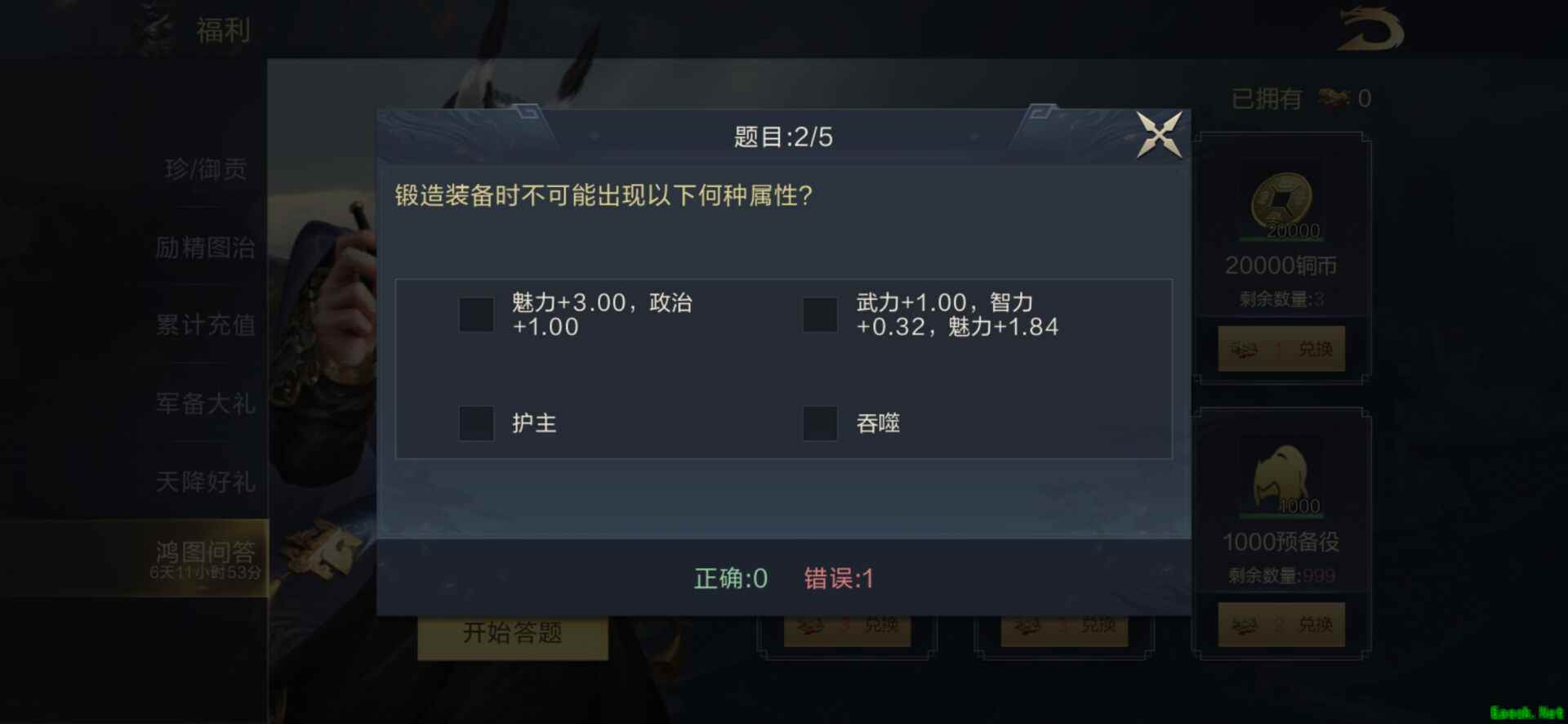 问题: 锻造装备时不可能出现以下何种属性? 选项: 魅力+3.00,政治+1.00、武力+1.00,智力+0.32,魅力+1.84、护主、吞噬 答案: 吞噬 活动介绍: 每天可进行一次答题,每次答题共有5道题,答题结束后根据正确题目的数量发放活动道具。没有答对获得1个活动道具,答对1题获得2个活动道具,答对2题获得3个活动道具,答对3题获得5个活动道具,答对4题获得7个活动道具,答对5题获得10个活动道具。 活动共持续7天,每日0点重置答题状态。 可在商店处通过活动道具兑换物品,物品剩余数量为活动期间可兑换的总数量,剩余数量为0后不可再进行兑换。 进行兑换后会对拥有的活动道具进行相应的扣除。 以上就是小编整理关于《鸿图之下》锻造装备时不可能出现以下何种属性答案介绍的全部内容,想知道更多相关资讯攻略的请关注易采游戏网。 本文内容来源于互联网,如有侵权请联系删除。 |