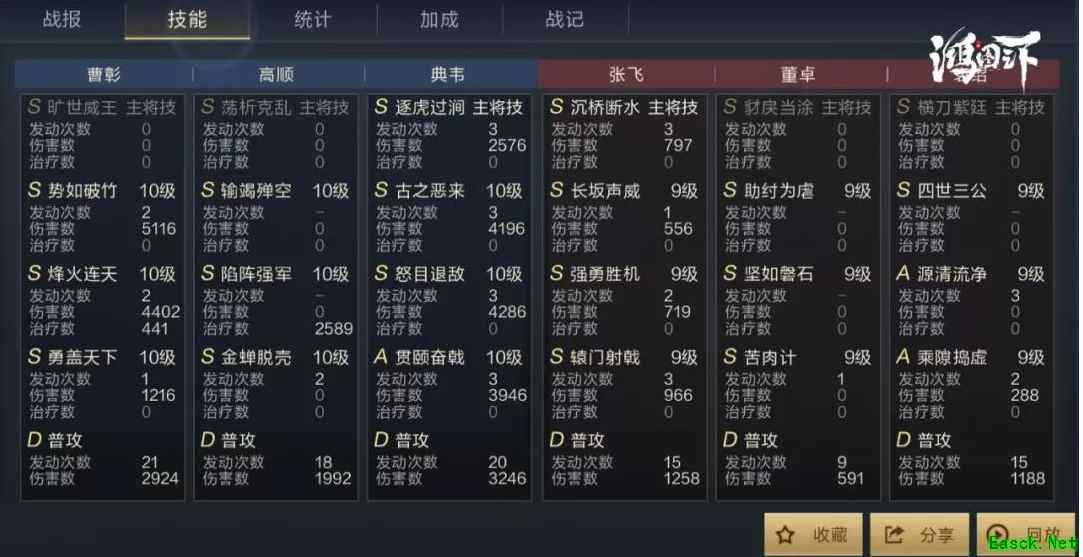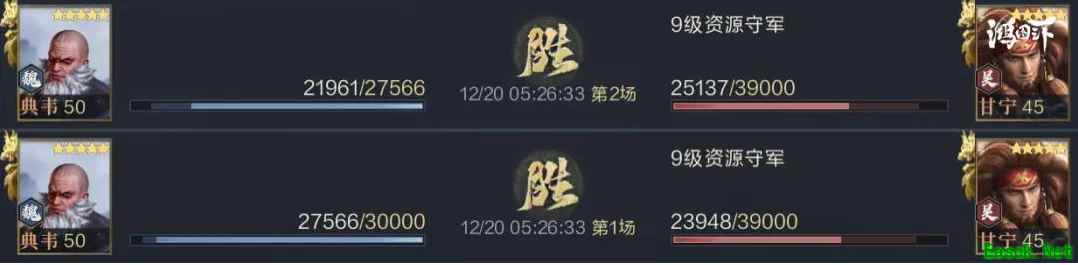 曹彰的属性并不算优秀,但自带武技的效果非常不错,能够让队伍的减防链更加强力稳定。曹彰的武技学习自由度较高,搭配输出类武技即可。 典韦本身拥有非常不错的武力、攻速成长,配合队伍减防效果能让自带武技的暴击收益达到最高,即使是没有合聚群雄效果的情况下,也有非常强的输出空间。如果能给到合聚群雄的话,典韦完全可胜任单核要求,但需要队友配置净化武技保证输出稳定。 三、技能配置 1.典韦 队伍核心输出点,整体属性非常适合连击路线,武技带有暴击加成,配合减防和破甲效果收益很高。 1号武技推荐怒目退敌,能在触发时降低目标防御并造成伤害,配合高顺提供的减防、破甲效果非常适用。 2号武技推荐贯颐奋戟,能在触发后使目标受到的武力伤害增加,可在降防效果和破甲效果之上再次提升队伍的输出上限。 2.高顺 队伍核心Buff工具人,有不错的前排承伤能力。 1号武技推荐陷阵强军,该武技可强化我方全体步兵武将的破甲和励军效果,一定程度上队伍即使不带恢复技能也具有续航能力,是非常实用的辅助技能。 2号武技推荐金蝉脱壳,恢复类武技大多依靠智力计算,而高顺的智力成长并不高,所以同时带有净化效果和抵挡效果的金蝉脱壳比较适合高顺,可以规避掉不少主动技能伤害。 3.曹彰 队伍副输出点,主打减防和针对性输出。 1号武技推荐强勇胜机,该武技可对敌方智力最高的武将造成一次高额单体伤害,虽然发动几率比一般主动武技低,但冷却时间也非常短,特别适合用于狙击敌方治疗和输出。 2号武技推荐乘隙捣虚,该武技可对敌方防御最低的敌人造成一次单体伤害。根据技能释放顺序,这个武技会是曹彰最后释放的技能,理想状态下防御最低的敌方是受到来自典韦+高顺+曹彰三个人减防效果,防御力至少减半,可让乘隙捣虚打出远高于面板的伤害值。 四、实战效果 这里以9级地作为测试,第一场仅损失4000兵力便取得了胜利。从战报统计可以看出,典韦与曹彰两个输出核心都造成了巨额伤害。由此可以看出步兵输出队的可行性是非常高的。该队伍更适合于中期交战,当然用于打地也有不错的强度,可以穿9。