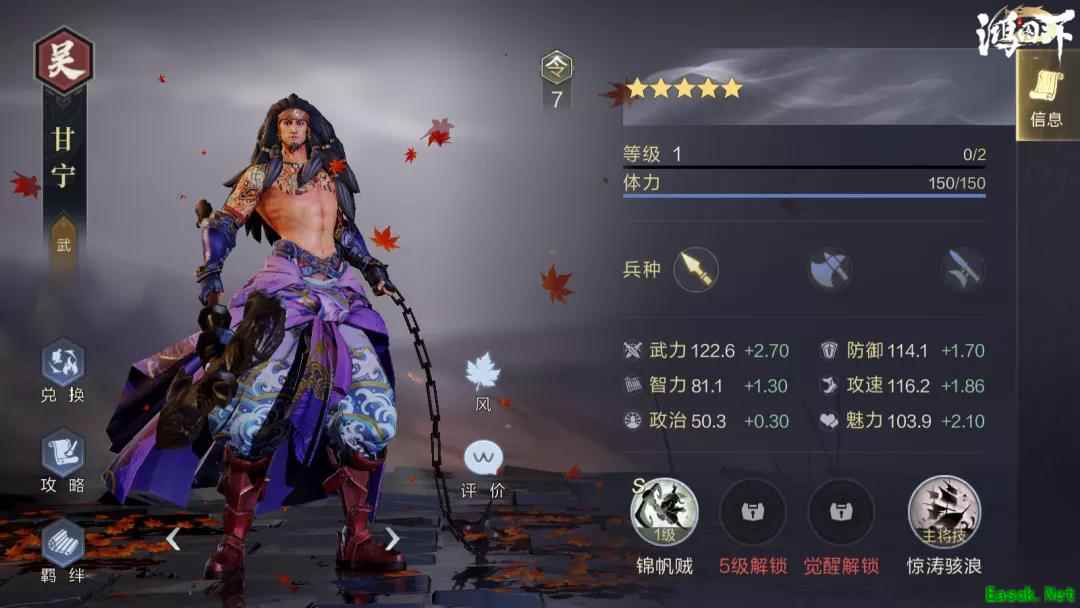 如果只用作开荒,一个甘宁足以,只在雨天出战即可。技能选择武技点数少的A级技能穷兵黩武。