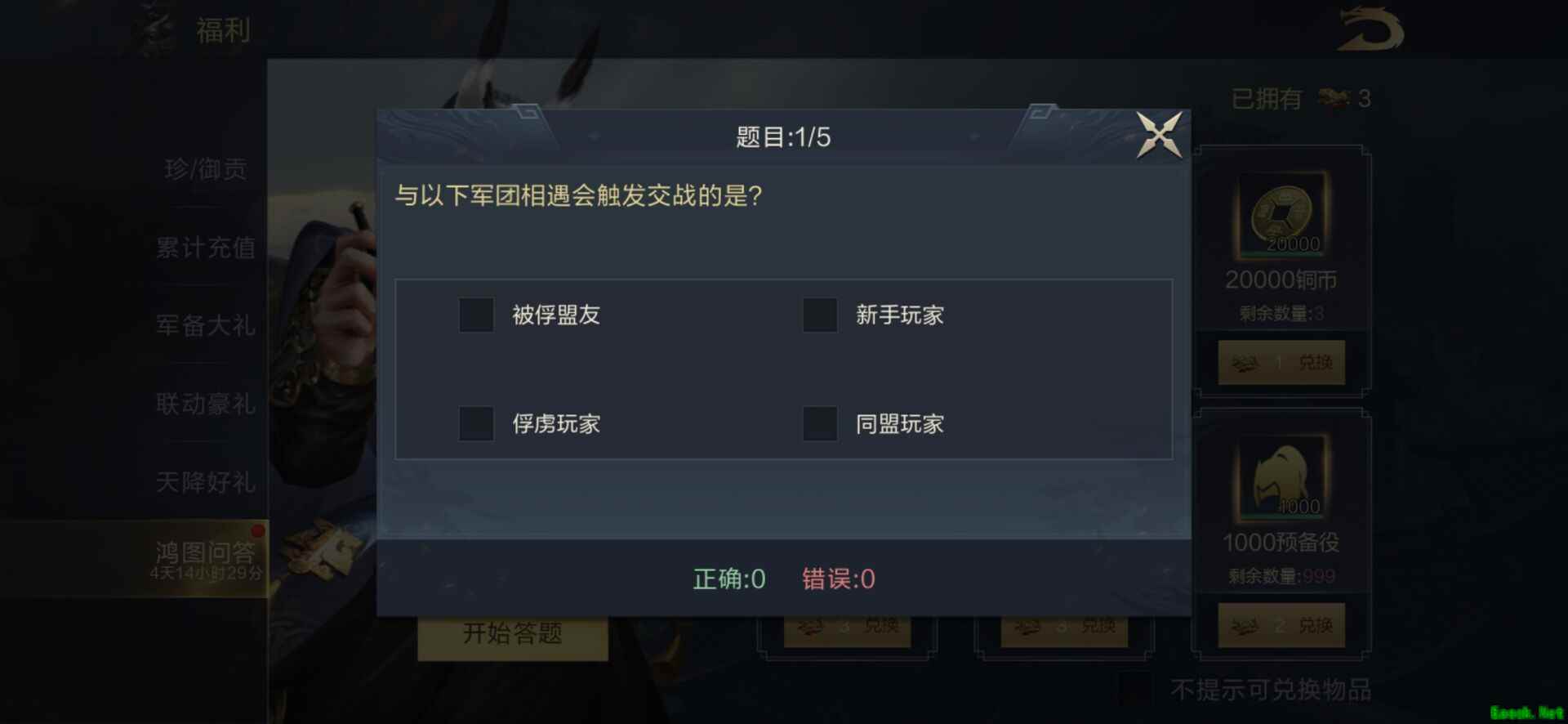 问题: 与以下军团相遇会触发交战的是? 选项: 被俘盟友、新手玩家、俘虏玩家、同盟玩家 答案: 被俘盟友 活动介绍: 每天可进行一次答题,每次答题共有5道题,答题结束后根据正确题目的数量发放活动道具。没有答对获得1个活动道具,答对1题获得2个活动道具,答对2题获得3个活动道具,答对3题获得5个活动道具,答对4题获得7个活动道具,答对5题获得10个活动道具。 活动共持续7天,每日0点重置答题状态。 可在商店处通过活动道具兑换物品,物品剩余数量为活动期间可兑换的总数量,剩余数量为0后不可再进行兑换。 进行兑换后会对拥有的活动道具进行相应的扣除。 以上就是小编整理关于《鸿图之下》与以下军团相遇会触发交战的是答案介绍的全部内容,想知道更多相关资讯攻略的请关注易采游戏网。 本文内容来源于互联网,如有侵权请联系删除。 |