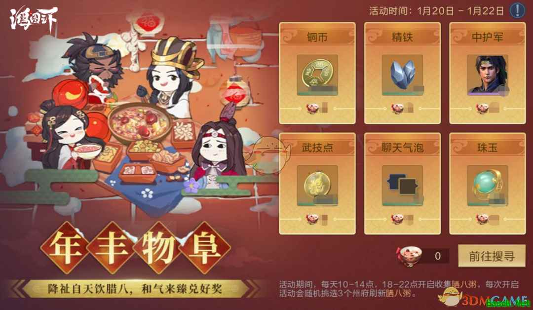 《鸿图之下》1月20日更新内容一览一、新活动 【年丰物阜】:2021年1月20日-1月22日 1、活动开启时间为: 2021-01-20 10:00:00至2021-01-22 23:59:59。 2、活动期间,每天10-14点,18-22点开启收集腊八粥,每次开启活动会随机挑选3个州府刷新腊八粥。 3、州府包括:洛阳、邺、长安、许昌、临淄、蓟、成都、晋阳、交趾、下邳、新宁、敦煌、吴。 4、活动每天最多可领取6个腊八粥。 5、玩家可以使用腊八粥在活动商店内兑换各种奖品。 6、活动结束后,未兑换的奖品将不再能兑换,且腊八粥失效。