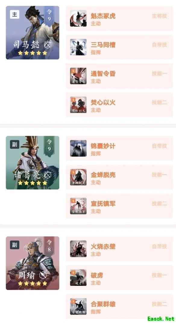 三、赵云 把赵云称为S1最强输出武将也不为过,在合聚枪被开发出来后,赵云一直被作为连击队的核心输出使用,无论是蜀枪还是与曹仁驻守的强度都惊艳了所有玩家。 一度将赵云+曹仁的队伍当做最强搭配,而赵云也成为了所有主公最渴望得到的那个男人。 S2赛季中相比各路黑科技打法,赵云队其实只是简单的“战法牧”组合,但无论如何赵云凭借武技和属性依然是最强的连击武将,合聚驻守和蜀枪也照样是非常强的阵容。 四、司马懿 如果要说S1中法师的高光时刻,那么一定是早期的魏智和赛季末的都督队、司马盾,除此自外再难寻觅到法师队的踪迹。 直到S2中对各种机制进行了调整,并且因为版本主流基本都为武力连击队,很少再有队伍会准备多个净化武技,甚至大部分队伍已经完全放弃了净化和沉默,队伍前排也都为主打武力防御的角色,于是司马懿与诸葛亮才有了足够的发挥空间,得以一同重返战场。 法师队的爆发与武力队差别并不算大,但坦度和武技释放都有一定缺点,特别在目前以爆发为主的打法趋势中,需要时间来周期释放武技的法师队很难生存。 司马懿可凭借自身独特的武技特点,让周期释放的缺点转化为优点,全新的司马盾和大军师应运而生,在交战和野地中都展现出了不俗的风采。