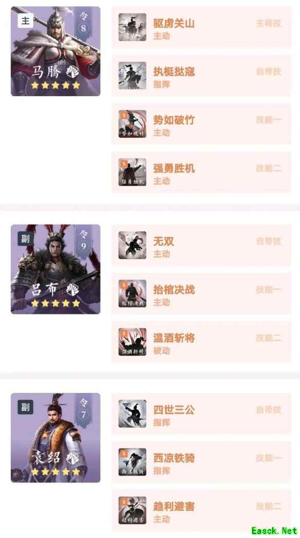 二、吕布 吕布在S1中的表现非常中规中矩,虽然有着最高的武力属性,但他的自带武技偏向于控制,主将技则是降低敌方武力伤害。相比于自带暴击加成的张飞和免缴械的赵云来讲,吕布在输出方面的优势并不高。 直到S2中马腾这个可为骑兵提供多种加成的武将出现之后,凭借骑兵阵容高额加成与马腾双C打法,吕布一跃成为S2黑马,在交战中常常在10到30秒就可以完成击杀,甚至10级地也仅需20到40秒解决战斗,堪称黑科技。 吕布目前的武技搭配主要是抬棺决战+辕门射戟或抬棺决战+温酒斩将,前者主打爆头,后者提高爆发能力,都具有很强的输出能力,并且阵容也是较为固定的搭配。 马腾搭配势如破竹+强勇胜机作为核心提升点必须保留,另一名角色可以用董卓、袁绍、公孙瓒这三个群势优秀辅助,辅助武技都搭配西凉铁骑+趋利避害/谋定而动,可以根据需求特点自行决定。