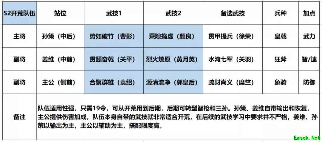 《鸿图之下》孙策姜维开荒阵容搭配攻略一、阵容配置 开荒时最注重防御和恢复,凭借这些特点可以有效降低战损,所以像姜维和孙策这样自带恢复能力的输出武将是非常适合开荒使用的。 主公只需消耗5将令值即可换取武、智双加成效果,姜维也是为数不多可吃智力加成的连击武将,队伍整体依靠自带武技就有不错的开荒效果。即使是在前期未到20级时,仅学一个武技就可轻松开荒到五级地,到后期可穿9级地。该阵容对武技的要求较低,队伍成型速度快,后期易转型。