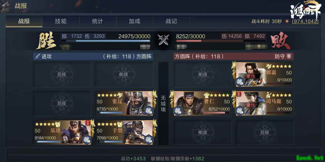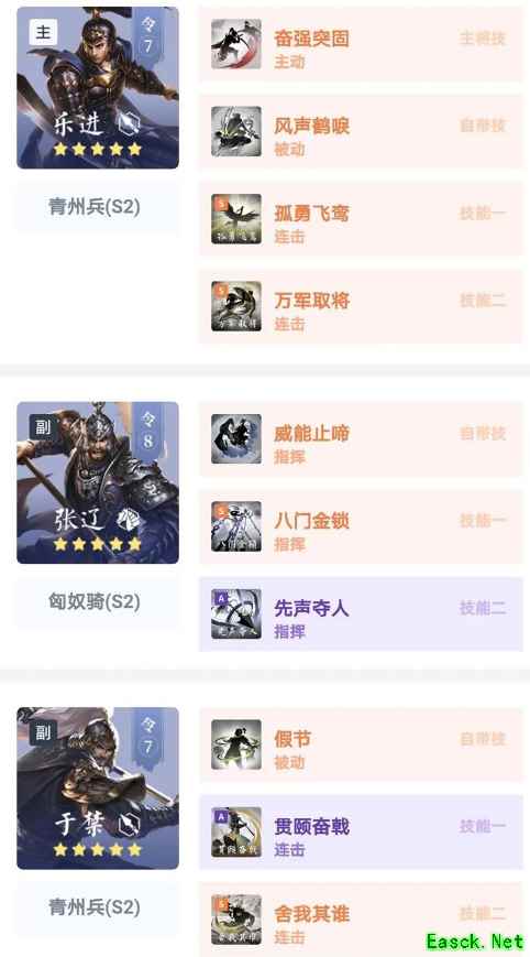 首先,张辽的定位就是纯技能工具人,自带武技威能止啼可让双核的输出附带沉默特效,自身携带八门金锁保证能越过前排直击敌后,因为敌我都会有缚足效果,所以张辽无需配置输出技能,搭配先声夺人或其他辅助技能即可。 于禁依靠假节能获得高额属性加成,与乐进同列帮助其补充伤害,并分担部分伤害,保证队伍在无坦度、续航的情况下能够快速爆头获得胜利。 三、技能配置 1.乐进 队伍核心输出,对沉默状态的敌人能造成高额伤害,所以配置上主打沉默技能,配合威能止啼能大大提高沉默施加概率。 1号武技推荐孤勇飞鸾,该武技触发时可造成一次武力伤害,并有概率对目标施加沉默状态,在攻击异性目标时有额外提升率,即可施加沉默,也可受乐进自带武技影响,打出高于面板数值的伤害量。 2号武技推荐万军取将,该武技的伤害率也不算高,但能对沉默中的敌人造成50%的额外伤害,配合乐进的自带武技增幅率高达120%,是乐进的主要爆发技能。 2.张辽 队伍技能工具人,负责为队伍提供精准效果和沉默特效。 1号武技推荐八门金锁,该武技可在前20秒提高我方全体武力,并百分百让自身和敌方前排陷入缚足,该技能提供的武力加成配合羁绊和乐进的主将技可在前20秒形成爆发期,缚足前排后可让敌方后排武将越过前排,以达到快速击杀敌方后排主将或核心武将的效果。 2号武技推荐先声夺人,该武技的属性偷取效果能提高我方双核的输出能力与承伤能力,同时削弱敌方的承伤能力,配合各种破甲效果使用能让双核的实际输出量大大提升,提高开局爆头的速度。 3.于禁 队伍核心输出,自带武技加成后能带来非常可观的武力、攻速,提高武技的触发次数和伤害量。 1号武技推荐舍我其谁,虽然队伍有八门金锁的缚足效果,但开局并非必定能触发沉默,还是有一定的失误可能,舍我其谁能够在触发后为乐进分担伤害,防止与爆发队交战时出现暴毙情况。 2号武技推荐贯颐奋戟,能够在触发时提高目标所受的武力伤害,于禁与乐进作为同列的武将,开局后他们会选择同一目标,该武技的伤害提升效果可让双核的所有输出都得到增加,进一步提升爆头能力和输出能力。 四、实战效果 五子良将队拥有非常高的沉默施加率和伤害输出,但长线战斗时略显吃力。因此,在面对主将在后排的主动队,如三孙、司马盾时,需要利用站位以及高额输出快速爆头敌方主将取胜。