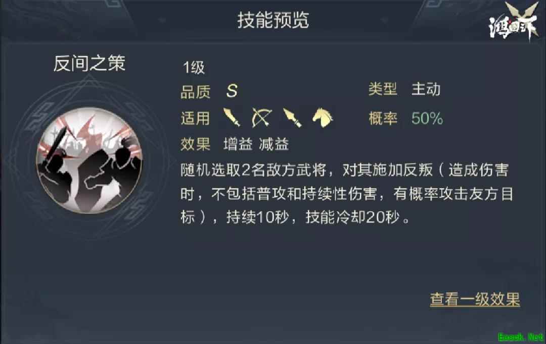 《鸿图之下》S3新武将曹叡介绍一、武将解析 曹叡的定位为辅助,属性中智力成长刚好2.0,但防御与攻速成长较差,仅有0.5的防御成长与0.92的攻速成长,在坦度与先手能力上比其他五星辅助稍显逊色,其自带武技拥有“反叛”效果,并不需要曹叡自身进行输出。 二、自带武技解析 反间之策带有反叛效果,该效果可使敌方武将在造成伤害时有概率攻击友方目标。除了普攻与持续性伤害以外,连击、主动、反击等都会被反叛影响。该技能与美人计不同,并不会计算曹叡自身属性和兵力,而是直接影响敌方的攻击。