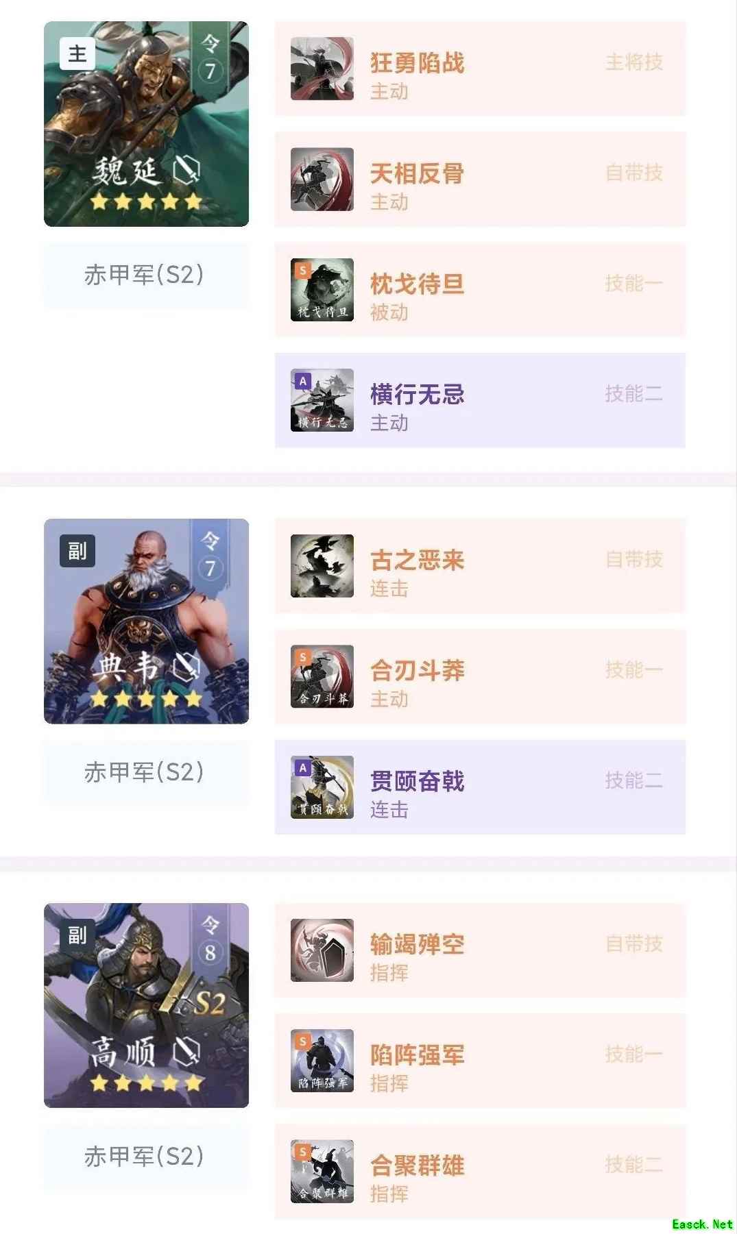 《鸿图之下》高顺典韦阵容搭配攻略一、阵容配置 这个阵容拥有稳定输出、周期性爆发与充足的续航,并且无惧长时间的鏖战。甚至可以说该阵容更适应长时间鏖战,因为枕戈待旦、输竭殚空、古之恶来都需要时间来进行叠加,达到最大收益时至少已经在40秒左右。 典韦和魏延都是半肉半输出定位,队伍整体都有着非常不错的励军效果,如果打满时间一般能恢复一万兵力左右,在降低战损方面非常不错。并且依靠强大的励军效果在对局中有着非常不错的续航能力,相比自杀式的大刀队更适合持续战斗。