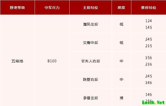 五级地守军介绍【五级地基本情况】 五级地的技能搭配中出现了较多拥有净化、禁疗、驱散的技能,虽然五级地守军的品质、技能等级都远不如玩家配置。但考虑开荒过程中需要跨级,在队伍武将未满20级仅有两个技能的情况下打五级地,比较容易出现失误情况,若挑选了错误的野地,也容易出现较高战损。 【五级地守军配置】