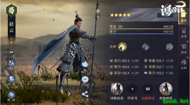 SP赵云武将介绍【武将介绍】 经过数个赛季的事实验证说明,大多数情况下,武将的属性值比其自带的技能更重要,其中攻速值最为关键,它几乎决定了武将的出手效率和武力加点空间。 SP赵云拥有极高的基础武力、攻速,二维成长均达到2.7(武力2.8),满级白板的SP赵云也拥有250+的攻速,远远大于阈值要求。 建议主公们在前期加点时可全速加点,让赵云尽早达到阈值要求,随后可根据队伍需求选择武、速加点。