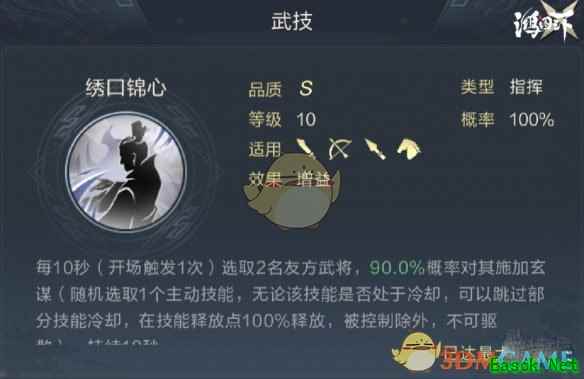 《鸿图之下》简雍技能介绍1.主将技 对范围内的敌军共造成120.0%智力伤害,并降低其10.0%主动技能释放概率,持续10秒,技能冷却20秒。 针对性降低敌方主动技能释放概率的主将技,实战想要发挥作用吃对面阵容,很多时候即使降低了10%也无法体现在战斗中,不推荐作为主将。 2.自带技能 绣口锦心提供的玄谋状态是S4中新加入的技能状态,该状态能随机选择1~2个友方武将(优先主将)携带的1个技能,让这个技能下次发动时必定成功,并会跳过该技能一部分冷却,对输出武将的技能发动效率提升帮助非常大,可以改变技能的释放周期,关于简雍的深入解读会在之后单独制作攻略为大家分析。