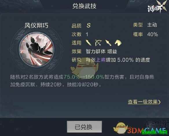 3.兑换技能 该技能输出率适中,核心在于释放后必定触发的免疫沉默,这类抵抗控制的技能用法较为广泛,特别是对输出链、技能联动要求非常严格的法师队伍提升较明显,可以配置给队伍中施加前置状态的武将提升联动效率,也可以配置给后手输出的武将让爆发稳定,如陆逊、张角等队伍核心。