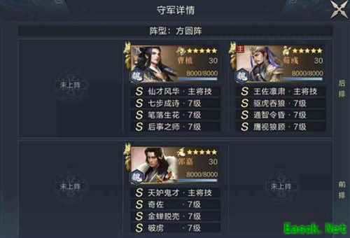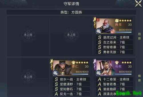 《鸿图之下》过关斩将第四章通关攻略1、在这个章节当中守军品质和队伍框架都有了很大的提升。 2、但是战队上漏洞还是很多的,主动队伍和连击队伍玩家可以打出爆头效果。 3、推荐玩家可以选择携带全员输出,在这里防守武将是可以不用携带的。 第一关 站位推荐:236 注:本关难度不高,常规阵容即可突破。