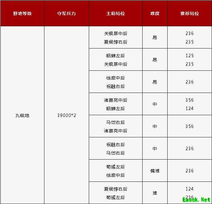 九级地守军介绍【九级地基本情况】 新赛季九级地中加入了不少新武将,这些武将的机制虽强力,但需足够的配合才能发挥效果,正因如此,巅峰赛季的九级地难度比起以往赛季反而稍简单了一些。不过超额的兵力和超过同时期玩家的武将、建筑等级,仍然是九级地的难度所在。 建议在尝试时准备补刀队,或是邀请好友帮忙垫刀,在此阶段,武将等级和技能等级基本成长到了极限,需要较高的领兵与属性城建支持才能单穿九级地,如果能集中资源将主力尽快提升至满级或高红度,则可以在建筑等级提升前就尝试单穿。 【九级地守军配置】