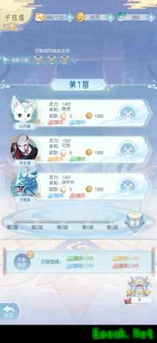 二、千珏塔 千珏塔共分为5层,掌门大人可根据自身实力进行攀登挑战,失败3次后当日挑战关闭。完成每日挑战,可获得“千珏令”、“善提心”、“念石”、“雍币”等丰富奖励,有助于提升刻印的灵海属性。每个挑战目标都有一定的亲和属性,与其相符的角色能够获得属性增幅,反之将被压制,所以掌门一定要选择属性相对应的刻印去挑战。