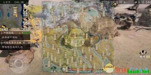 宝箱位置 从上图中我们可以看见有很多黄点,我们先拿城北为先例,其实很多小伙伴以为黄点是人或者野怪之类的,其实不是,黄点可以代表野怪但是还会代表宝箱、草药、矿石等等,所以小伙伴们只需要挨个查看黄点即可轻松获得宝箱。