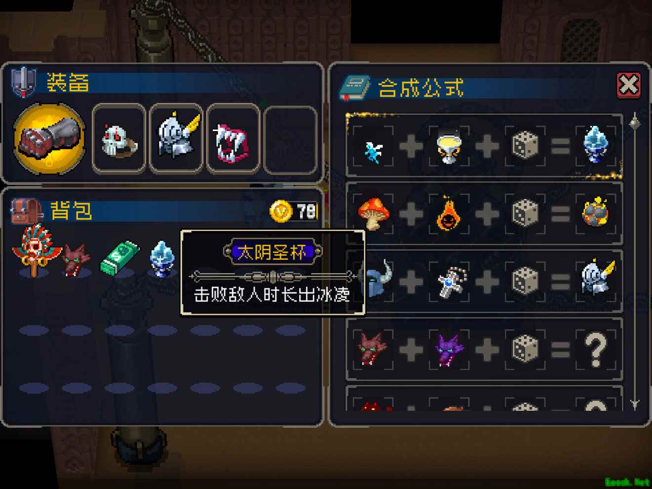 太阴圣杯 冰精灵+圣杯=太阴圣杯(简介第一眼看成了冰激凌)。 这个冰(激)凌可以理解为一个短时间存在的障碍物。 至于实用性。不咋实用,除了堵一些近战怪,就没用其他好处了(从坏处来看,持续时间较短也是好处了)。 坏处那多了,不仅浪费用来合成的道具,还容易把自己卡住(这点在传说难度更容易体现),然后被各种远程怪殴。 所以,除了玩套路的大神,个人建议不要浪费冰精灵和圣杯去合成。