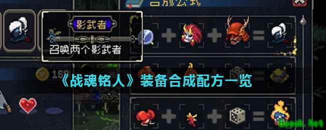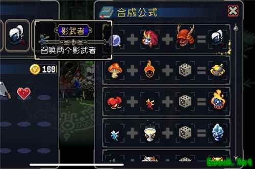 【装备合成配方】 帝王引擎=血+攻速药水+任意一个。 太阳圣杯=冰精灵+圣杯+任意一个。 圣里贝刘思=头盔+十字架+任意一个。 银舞者=镜子+鬼脸+武士头。 最后的祭品=鬼脸+滴血刀+任意一个。 招财之源=毒圈+招财猫+任意一个。