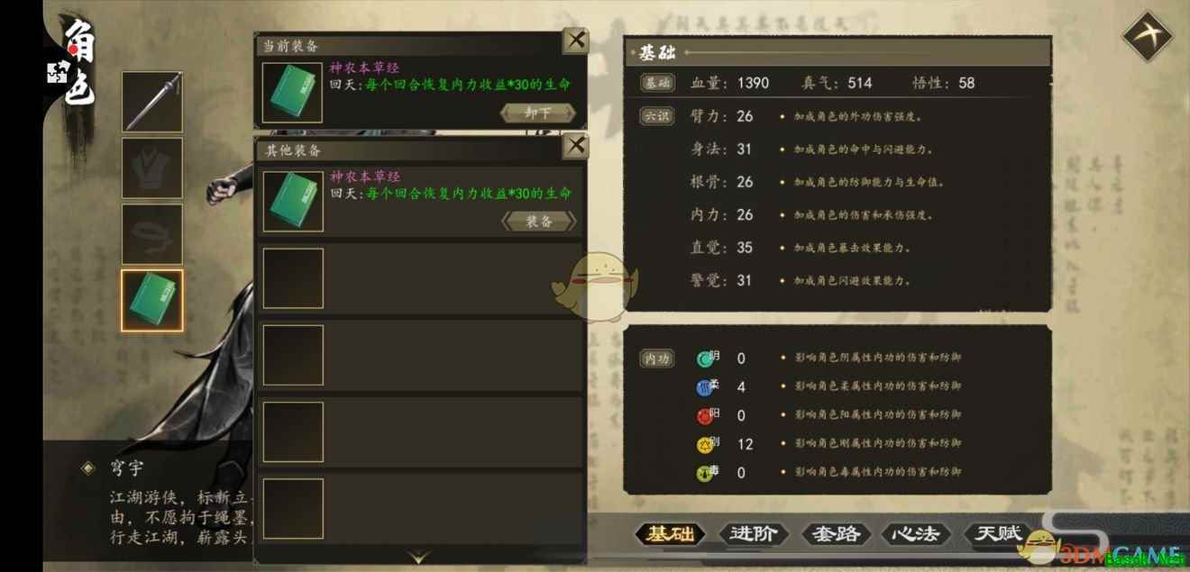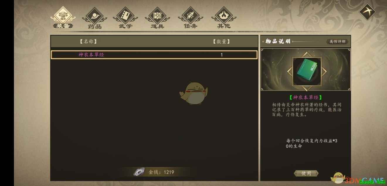 3、新手村的钓鱼位置在司晚晴晕倒的地方旁边,在这里玩家可以钓到一本秘籍和很多的鱼。 4、钓到的秘籍叫做神农本草经,效果可以每个回合恢复内力收益*30的生命。