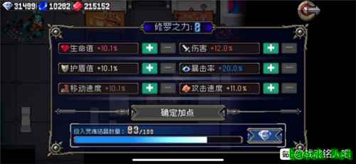 而且修罗之力点到后面是越来越贵,原先点一次是加1%,后面是点一次加0.1%,强行让加点收益无限递减。往里面砸几十万宝石的实际效果不大,还不如练练操作。 以上就是小编整理的关于《战魂铭人》修罗之力开启方法介绍的全部内容,更多游戏攻略请持续关注手游网! 本文内容来源于互联网,如有侵权请联系删除。 |