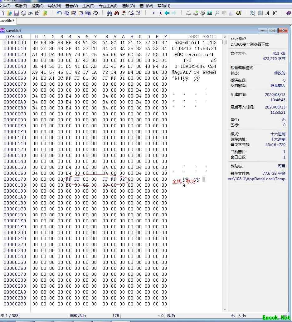 内部存储Androiddatacom.xiayizhanjianghu.TapTapfiles 2、修改工具:Winhex 3、修改数据位置如图