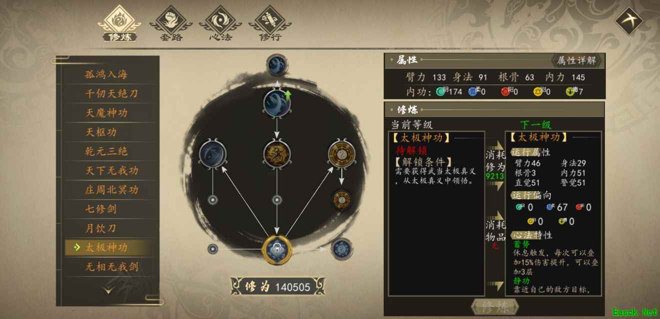 属性: 心法,柔 获取方法 1、杭城镖局接接支线任务:护送武当。 2、获得武当初阳功。 3、武当(252,260)处对话陈州同获得纯阳剑诀。 4、将纯阳剑诀点满后再次对话陈州同获得太极神功。