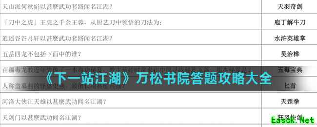 《下一站江湖》游戏中万松书院答题正确答案是什么?万松书院中的问题难倒了很多玩家,毕竟万松书院的题库还是非常多的,很多小伙伴不知道正确答案也是正常,那么接下来小编为大家带来《下一站江湖》万松书院答题攻略大全,一起来看看吧。