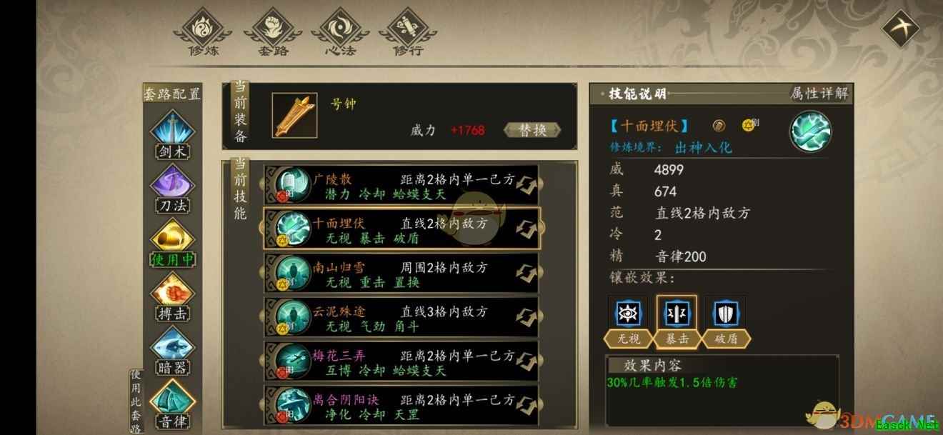 然后琴系技能,广陵散、梅花三弄、阴阳决有bug,描述的是可以降低所有技能两回合冷却,其实是四回合!这三个技能都是四回合!这意味着搭配九阴的武道(连斩特性),你的所有技能cd都变为0,先放一套技能秒杀一大片,再接一个重置技能cd,下回合又可以一套技能秒杀一大片……再搭配静功(反击特性),啧啧。 枪系武器不给力,只有一把800+威力的盘龙棍,即使如此,打真武七截阵也是砍菜切瓜。 对了,琴因为技能大都自带无视防御,所以主心法可以换为先天清气(攻防一体)刀、剑还没有开始研究。 以上就是小编整理的关于《下一站江湖》刚系流派心法推荐的全部内容,更多游戏攻略请持续关注易采游戏网! 本文内容来源于互联网,如有侵权请联系删除。 |