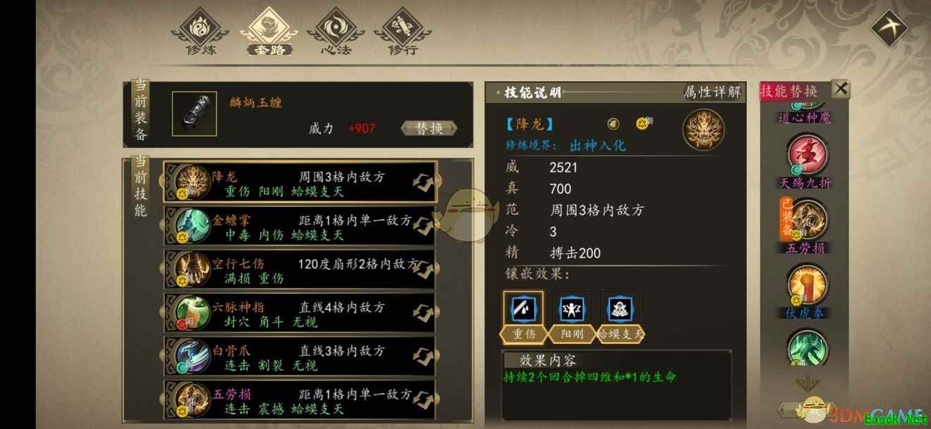 《下一站江湖》刚系流派心法推荐提前声明,因为我一周目还没通关,所以所谓的最强降龙套只是相对没有拿到纯阳无极功前的(目前我主线才到第五章),因为还不知道纯阳无极功属性是啥,所以并不确定当前心法套就是绝对的最强降龙套。 主心法:金蟾功,加入门派参加完武林大会(大概主线第三章)就可以获取,豪侠路线需要第五章后才能获取,这里我们主要用到金蟾功的主心法穿透效果-蟆吞天,让你的大部分招式可以无视对面防御,以降龙十八掌为例,在其他输出条件接近情况下,无视防御前降龙伤害4500左右,无视防御后降龙伤害6000左右!这还是我拿的900威力武器,天赋十三太保、狂战神、自愈情况下,如果拿的1800威力武器,天赋炽热、麒麟臂、神勇,伤害应该能达到8000+。