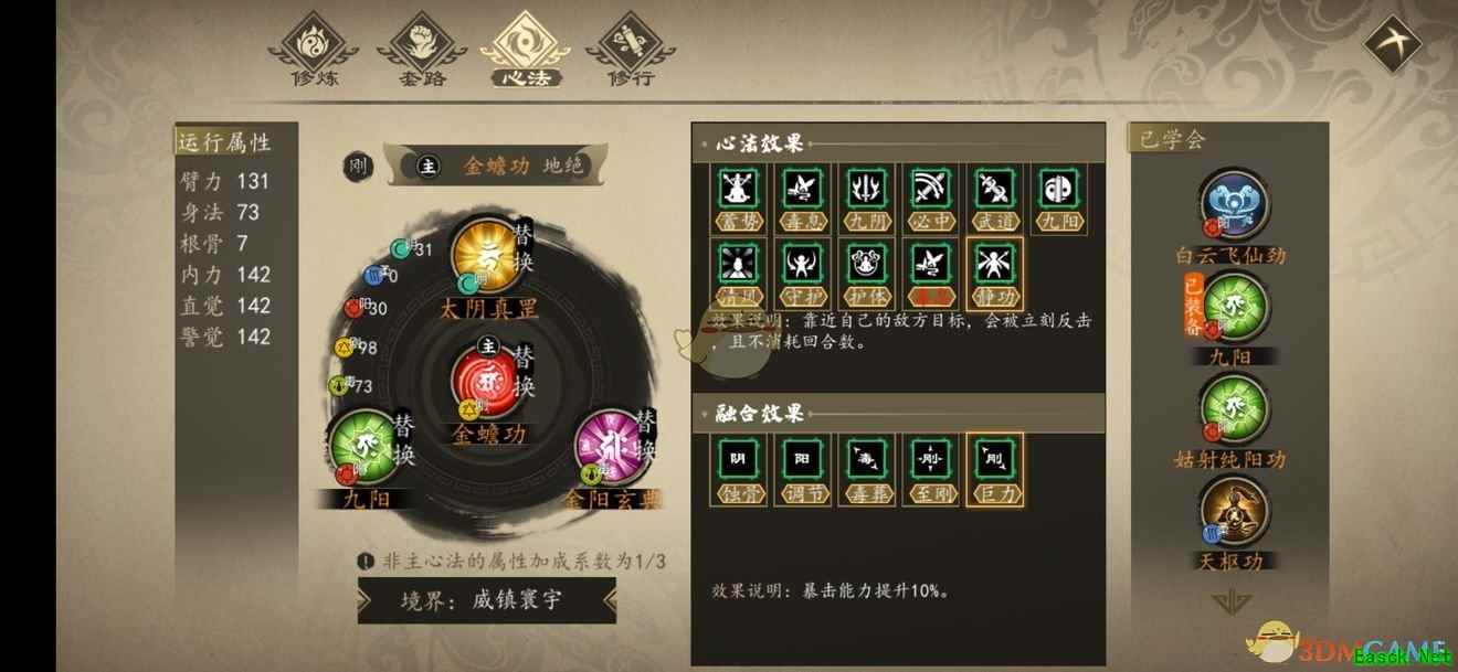 辅助心法: 九阴、九阳、金阳玄典 九阴特性: 必中(攻击必定命中)、九阴(所有招式附加800伤害)、真武(击杀敌人可以继续行动、生命越低伤害越高) 九阳特性: 九阳(阳刚系武学威力提升20%)、清风、守护、护体(后三个超强生存) 金阳玄典特性:毒息(没什么卵用)、静功(bug一般的存在,有敌人接近立即反击,不占用回合数,不消耗技能cd,少年,你想要无限降龙十八掌吗?只要仅装备降龙十八掌一个技能,手动战斗,往人堆里一扎,点休息,有人靠近打你就赏他一个降龙十八掌,这里降龙不点震退特性,技能cd是什么?不存在的,看谁不顺眼就跑他身边休息,从此江湖任你横行……)