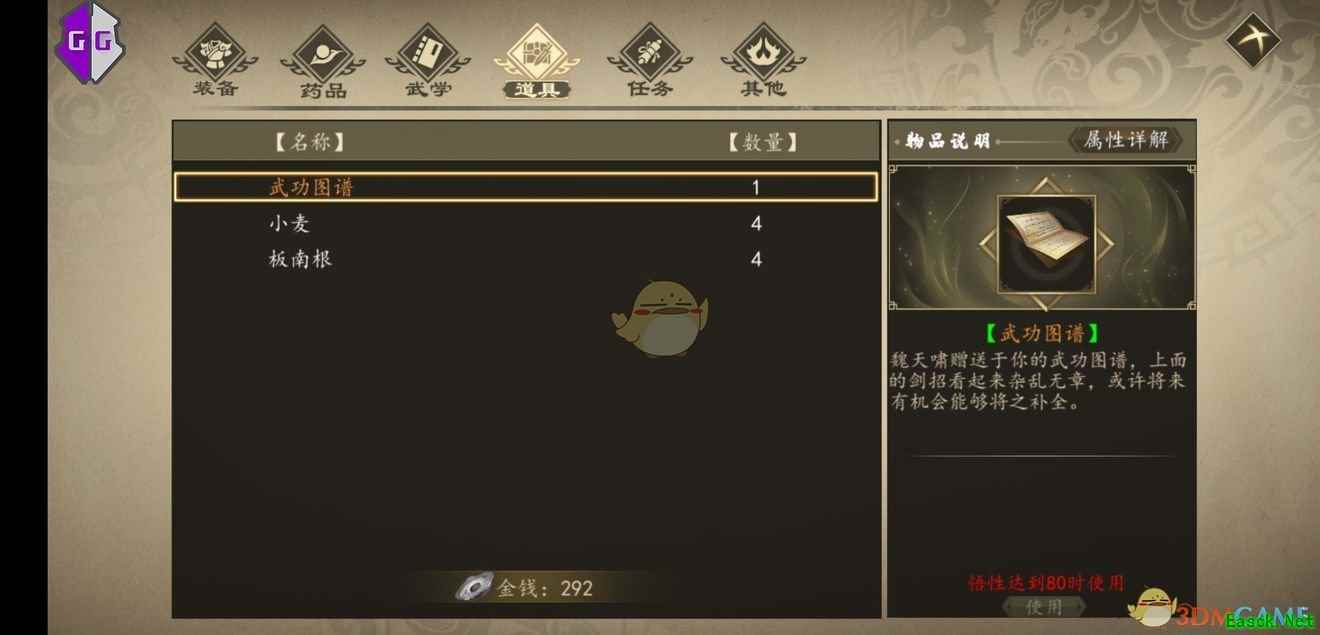 2、在行脚商人后面有个宝箱,玩家打开宝箱即可获得金创药。 3、然后在点击司晚晴,这时会出现选择。 4、玩家选择一扣除20道德,然后加500金钱。 5、玩家选择二,任务二需要金创药,刚刚玩家在行脚商人后的宝箱已经获得了,所以玩家选择任务二直接完成任务。 6、然后继续对话会出现敌人,玩家触发战斗。 7、玩家胜利后,继续对话,即可获得图谱,也就是九剑前置任务之一。