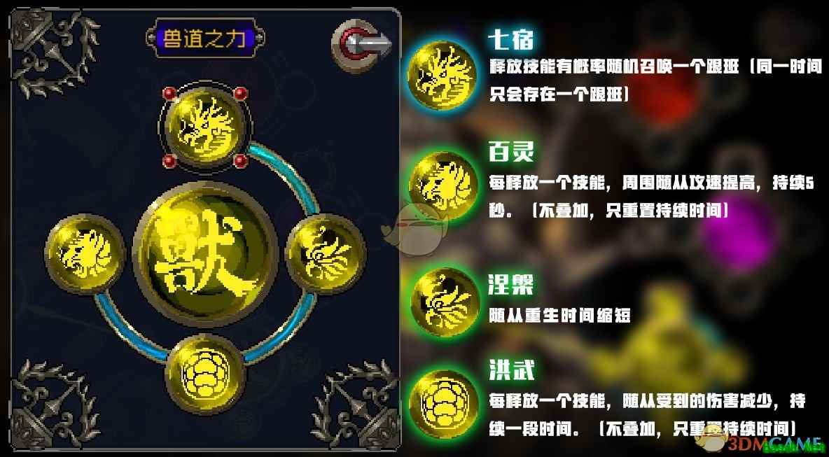 六道之力的作用: 每个“道”都有独立的风格,相应的【道之力】就是体现这一风格的镶嵌饰品。战士们可以依照各个角色技能以及自己的战斗习惯,选择不同的“道”进行搭配。 举个例子:图中的兽道就是以“强化随从”为风格的道。