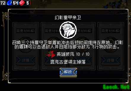 返回客厅找到肯,可以在这里查看已拥有的技能碎片和解锁BOSS技能。让我们先简单看一下都有哪些帅气的英雄技能! 大骑士技能:幻影重甲亲卫 召唤三个持盾守卫举盾前冲击后短时间维持在原地,幻影的盾牌可以击退敌人并且阻挡部分地方飞行物的攻击。