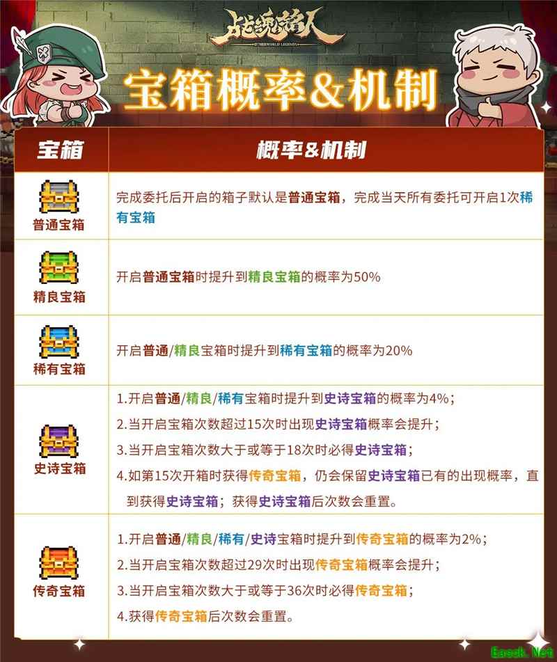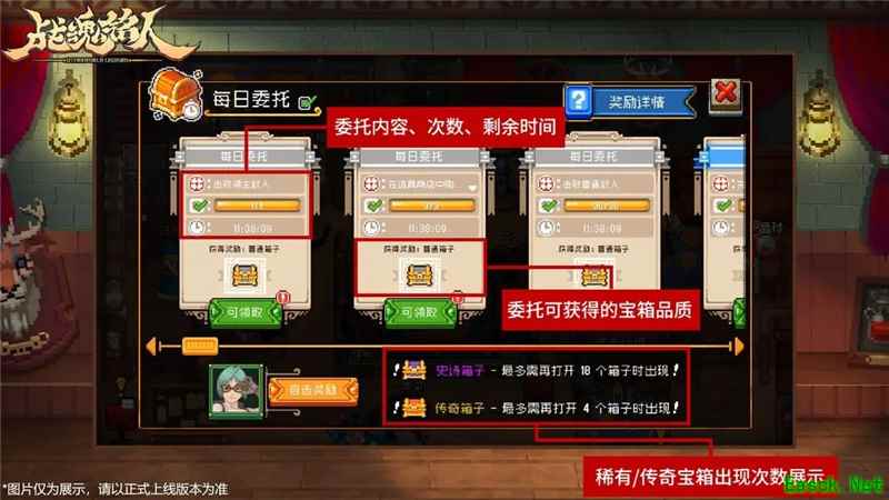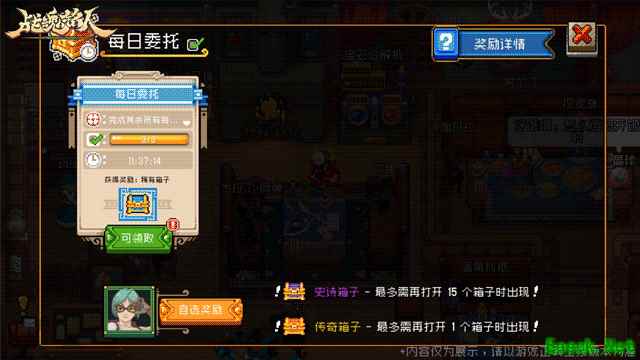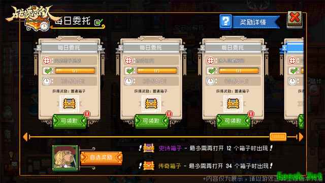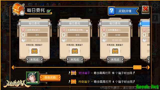 每日委托列表会显示委托内容、剩余时间和可获得的宝箱品质。 玩家每天最多可以完成4个委托,完成所有委托后可以开启1次稀有宝箱。 宝箱分为普通、精良、稀有、史诗和传奇五个品质,不同品质的宝箱奖励不同。 开启宝箱时还有概率提升宝箱品质,并且有保底机制,确保玩家在一定次数后必定获得高品质宝箱。