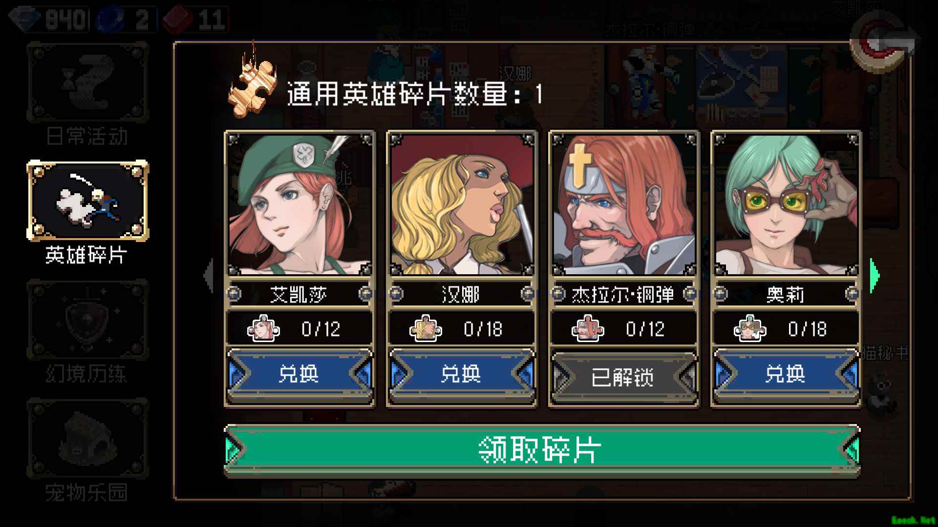 《战魂铭人》英雄碎片获取方法介绍通用英雄碎片可以用来兑换任意角色。 获取方式1:商店购买英雄碎片 获取方式2:通过日常积累的活跃的户,在幻境历练中,领取碎片奖励。