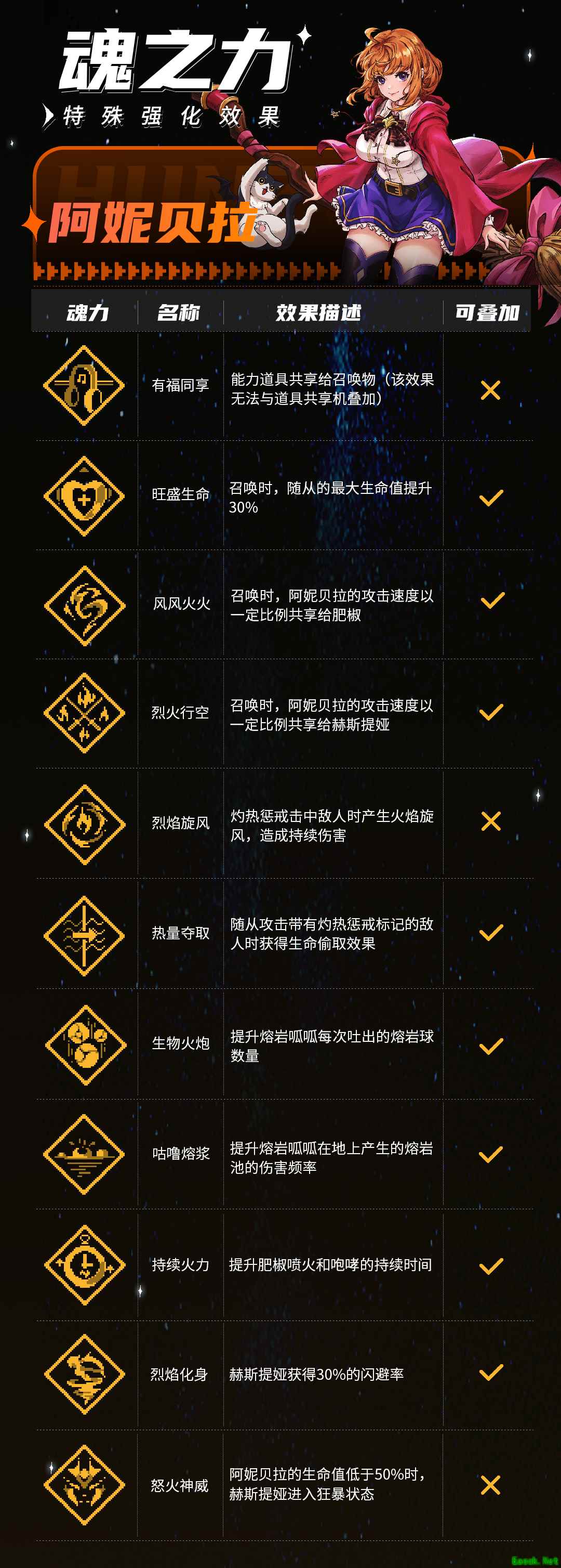 除了不同风格对技能的影响加持,阿妮贝拉还有以下这些专属魂力效果: