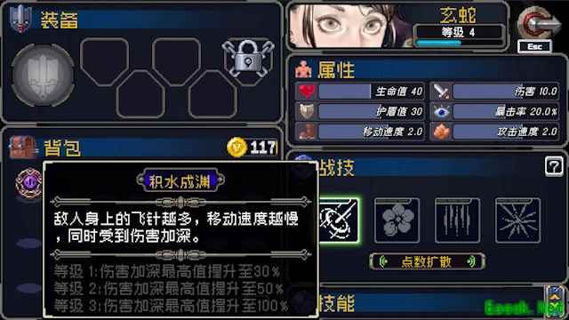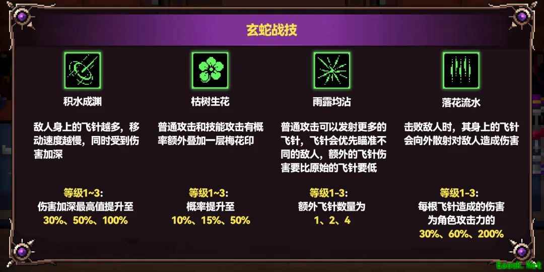 提升至等级3的战技会给英雄带来巨大的战力提升,一定要尝试升级到等级3喔! 玄蛇战技【落花流水】等级3的情况下,敌人阵亡后身上飞针向外散射,并造成不俗伤害。