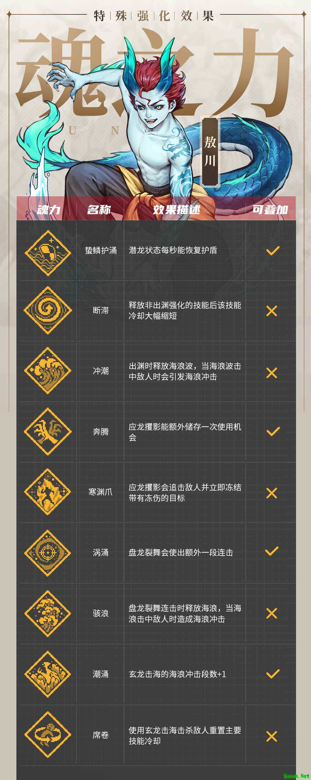啸浪出击,威力无穷,选用【技能风格-藏渊】:释放技能后进入“潜龙状态”;搭配【魂力-奔腾】、【魂力-冲潮】可以在短时间内连续释放4次带有“海浪波”的【应龙攫影】。 *当“海浪波”击中敌人时,会引发海浪冲击。