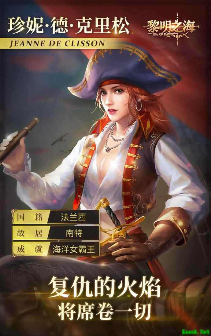 《黎明之海》珍妮角色图鉴一览珍妮 珍妮·德·尼克松,活跃于英吉利海峡德布列塔尼女海盗,百年战争中的知名传奇女性。1343年她的丈夫被俘,被菲利普六世在巴黎处以死刑。此后她招募水手购买了三艘船只,发誓要亲自手刃菲利普六世,从此开始了她海洋女霸主的事业。1350年菲利普病逝,她宣布退休回到英国,自此安度晚年。