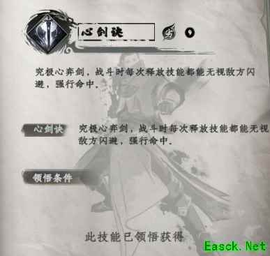 《下一站江湖2》心剑诀一览:心剑诀 心剑诀是一个传承已久,适用于剑术流派的护体秘技,可以使技能无视敌方闪避,必定命中。