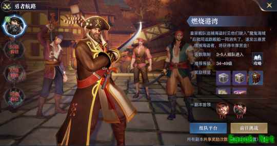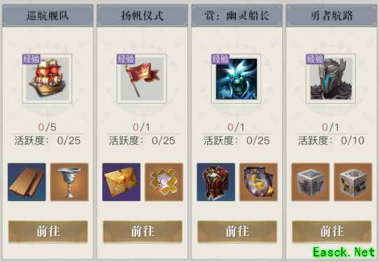 2、组队活动 每日活动中有四种需要组队完成的活动,分别为巡航舰队、扬帆仪式、赏:幽灵船长、勇者航路。 前三项巡航舰队、扬帆仪式、赏:幽灵船长,为前期的小副本,门槛较低较为简单,而第四项勇者航路门槛较高,有四种不同难度的副本可供玩家依照战力选择进本。