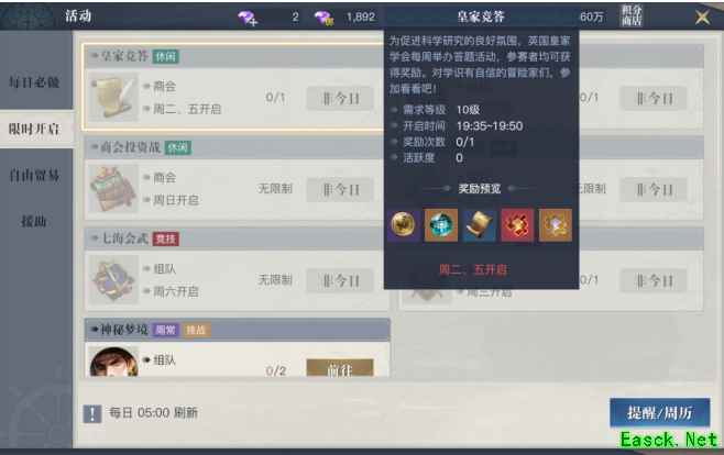 ①皇家竞答 开启条件:冒险家等级到达10级 开启时间:每周二、五晚19:35~19:50 为了促进科学研究的良好氛围,英国皇家学会每周二、周五晚上都会举办皇家竞答活动,参赛者都可以获得丰富奖励,其中就包括地中海藏宝图。对自己学识有自信的冒险家们都可以前来参加,回答正确后即可获得奖励。皇家竞答活动中的问题十分简单,非常推荐大家在周 二、五晚上前来参加,并获取更多丰富好礼。