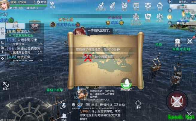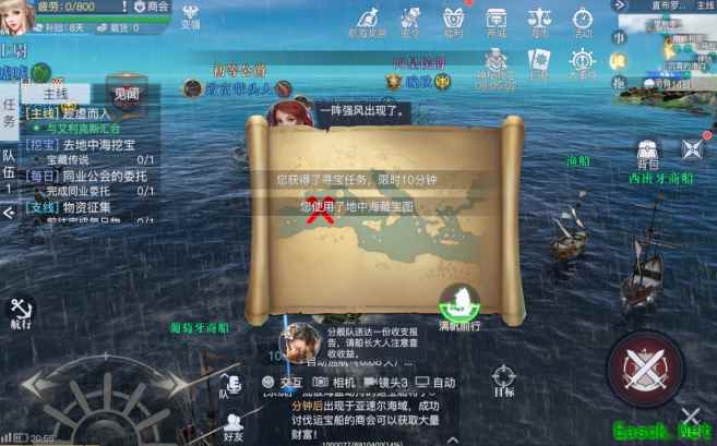 二、藏宝图寻宝玩法 1.地中海藏宝图 使用条件:冒险家等级到达30级 使用方法:在背包内点击后全部使用 寻宝玩法: 我们可以在包中点击并使用地中海藏宝图,使用后将会接取一个限时10分钟的寻宝任务,并给我们一张寻宝地图。我们可以根据寻宝图指示的方位来到海域中相同的位置进行寻宝,也可以交由电脑自动寻路挂机完成。完成寻宝后可以获得银币、紫色船首帆图纸、紫色船甲图纸、紫色魂石等丰厚奖励,非常推荐大家在空闲时挂机完成。